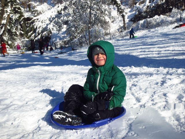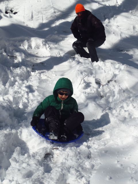 I love snow! That was the best as a kid to be right about Huck’s age and walk out the door unsupervised to go sliding(MN word for sledding)across the street from our house! We had one double hill and we would build jumps. If you got the right amount of speed and were positioned correctly, you would zip down the first hill, go over the jump near the second hill and slide down the second hill and pray you wouldn’t hit any bushes!