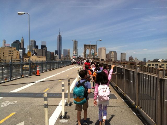 Walking across the Brooklyn Bridge with Lady Bug and pointing out NYC landmarks they’ve studied