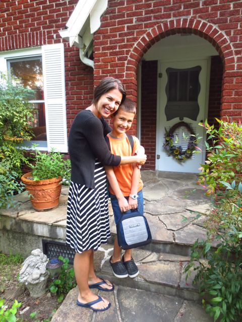 Monday morning found us waking up to our alarm clocks at 6:00. Huck instantly made his bed, which is completely out of character, and also got himself dressed without being asked, which was almost creepy. About ten minutes before we needed to leave, I found him standing at our front door wearing his backpack and looking outside. Even though he doesn’t tell us how he’s feeling about this huge life transition per se, I saw excitement in those brown eyes of his. And when I got my hard working camera out he said, “Now we actually have a house to stand in front of for the first day of school picture!” Which sounded exactly like something I would say.