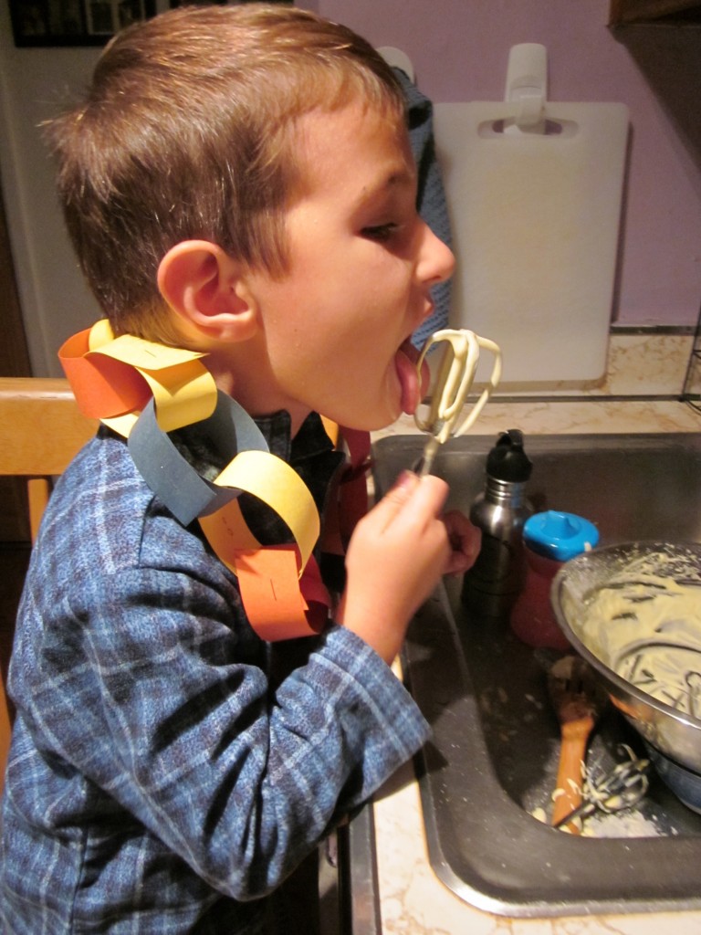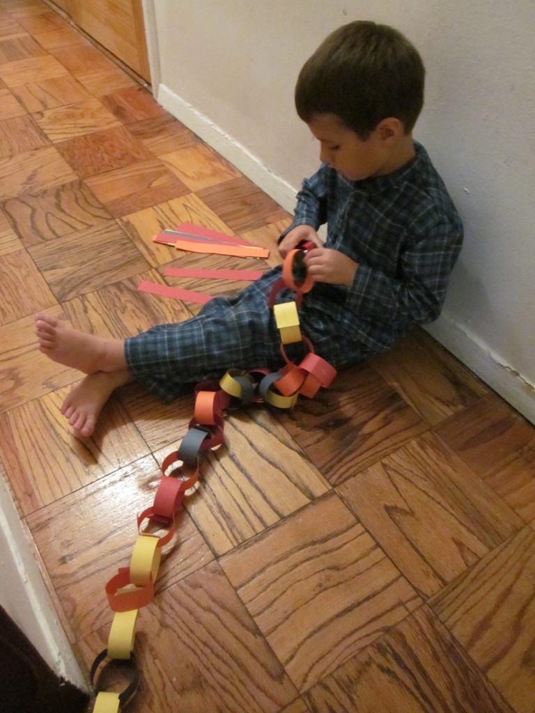 These days it’s all about getting ready for the Harvest Festival this Saturday and celebrating autumn by making miles and miles of paper chains that fill our apartment everywhere you look. Troy and Huck began an ambitious project over the weekend of spelling HAPPY HALLOWEEN with orange and black paper chains. After a lot of hard work they finally completed the first H, and that is how our front door is now decorated. I have high hopes that one day they will get to the A.