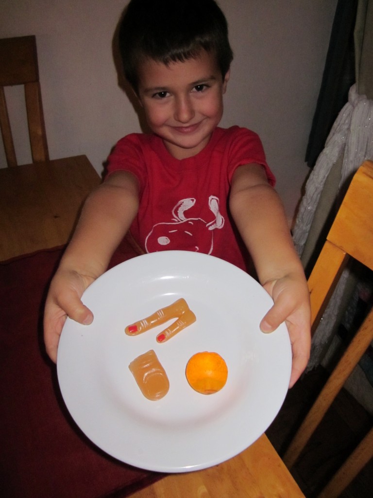 One of the only perks of having your mom organize a neighborhood event every year is that you have a say in the prize selection. Weeks ago Huck took the Oriental Trading catalog and spent many minutes carefully circling the things he thought I should order for the festival and putting a large H on the things he felt he should own. All the loot finally arrived and Huck was very happy to come home from school on Monday to a few “soft body parts,” a “neon sticky eyeball,” and some other disgusting objects waiting for him on his desk. Then we served some to Troy for dinner because we are very sneaky Halloween people.