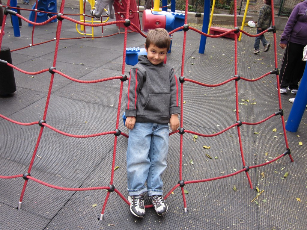 Last week Huck kept mentioning that his name was all over the school play yard. I assumed he and his friends had written their names in chalk on the blacktop or something. After a few days of this misunderstanding he finally took me out there to see for myself. And indeed, his name is clearly spelled out on every single black ball of the rope climbing mechanism. He claims all those balls are his (obviously) but promises to share them with everyone. When Huck saw this first picture he exclaimed, “There’s me surrounded by all my balls!”